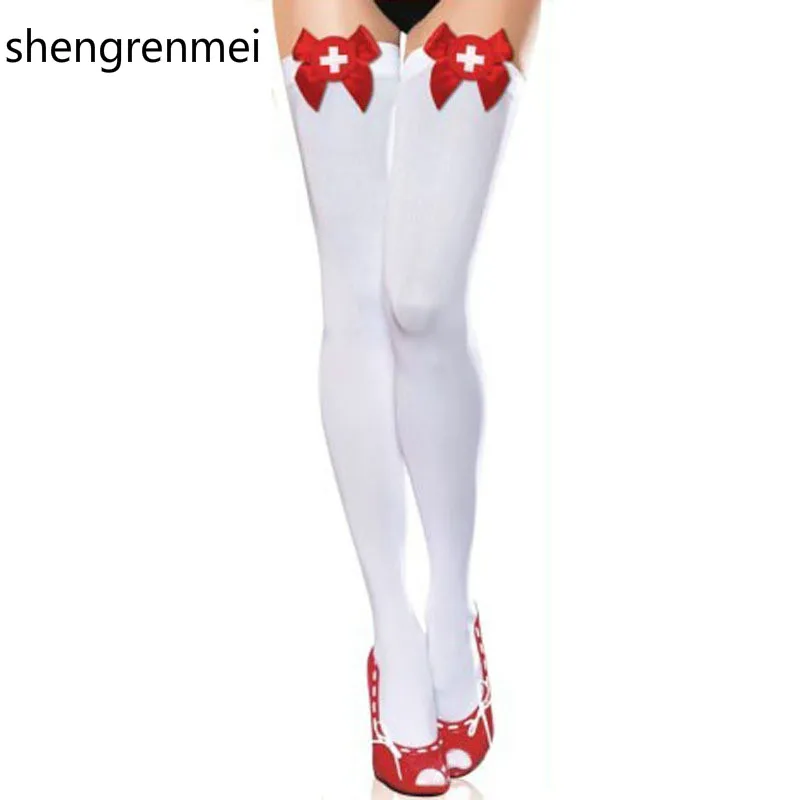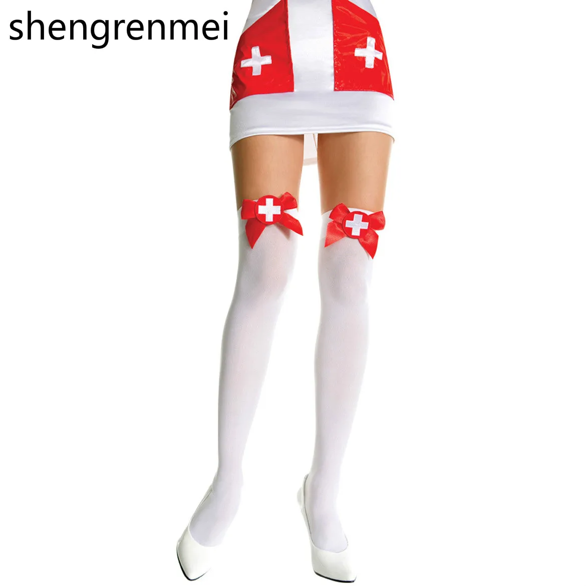 Related Product for shengrenmei 2019 Sexy White Nurse Maid Fantasy Role Play Thigh-High Stockings with Red Bow Top Erot