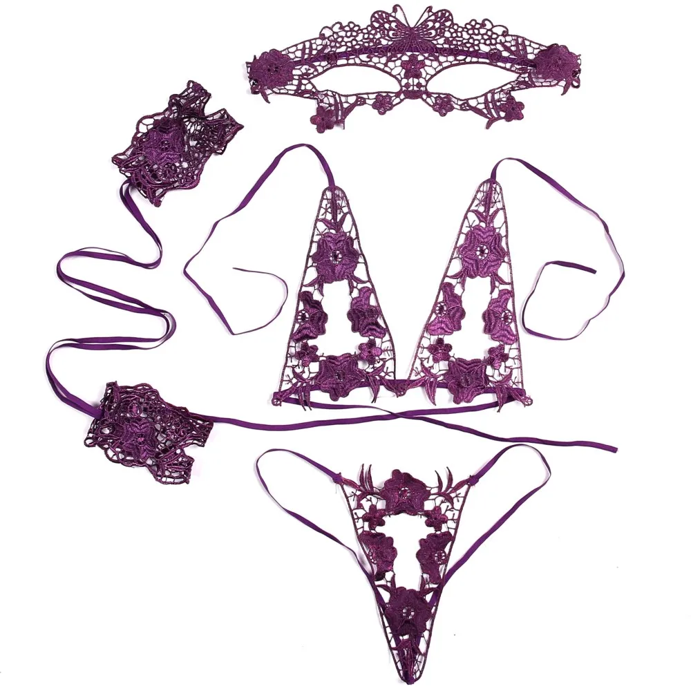 Related Product for 4pcs Set Women Sexy Underwear Purple Lingerie Bra Open Crotch Lace Hot Transparent Babydoll Dress E